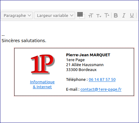 Thunderbird ne dispose pas d’éditeur de signature HTML.Voici comment se créer une signature avec ou sans logo : 1) Rédiger