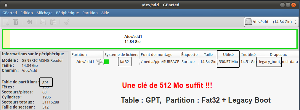 Créer une clé USB bootable Utiliser une clé d’au moins 1 Go Gparted : Créer une nouvelle table de partition