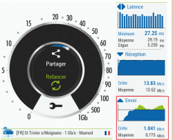 Ouvrir un navigateur internet : http://www.degrouptest.com/test-debit.php et lancer l’outil de mesure.. Exemple : (valeurs moyennes) FREE au 66 LHB :