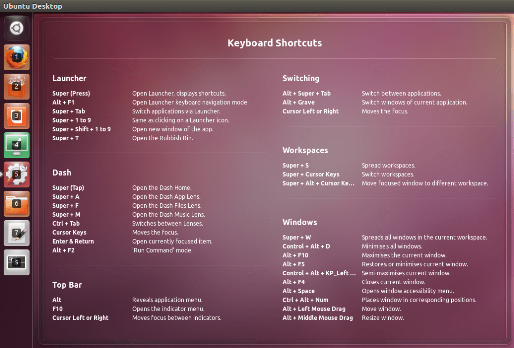 Pour voir la liste des raccourcis clavier sur Ubuntu, il faut appuyer sur la touche SUPER :