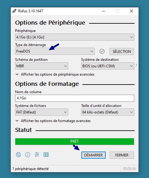- une clé USB créée avec RUFUS (choix : FreeDOS) + le fichier BIOS-UPDATE.EXE : renommer ce programme : Son nom doit être sur 8 car maxi « .exe » (la meilleure solution en 2020 : rapide et fiable)