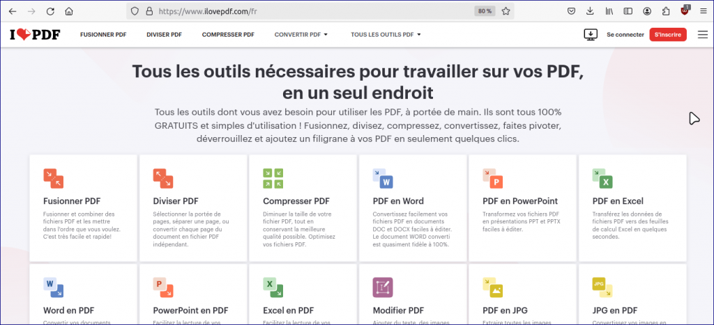 Très utile pour convertir les fichiers PDF au format image, ce site contient plusieurs outils en ligne pour gérer les PDF, gratuits et simples d’utilisation : On peut fusionner, diviser, compresser, faites pivoter, ajoutez un filigrane