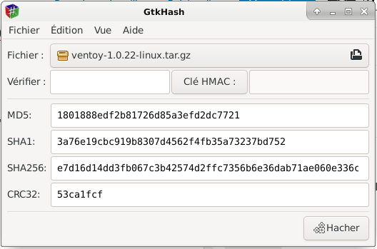 - Optionnel : Vérifier que son empreinte numérique SHA-256 est correcte. Cela peut se faire facilement avec l’outil GtkHash, disponible dans les dépôts Debian (apt-get install gtkhash) et lancer GtkHash au menu..