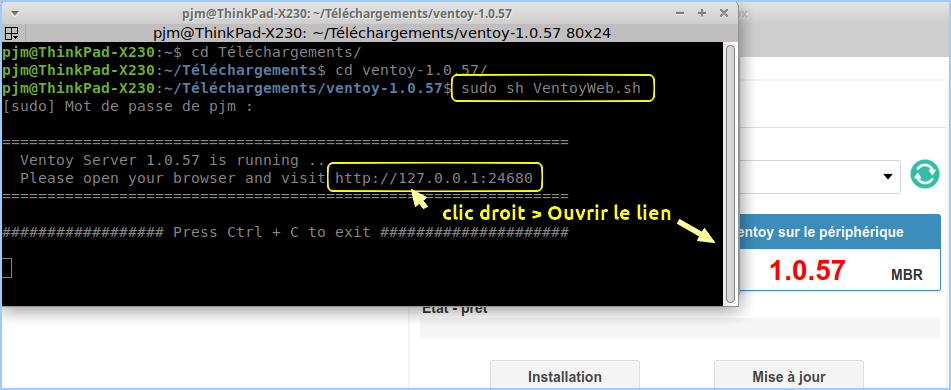 cd Téléchargements cd ventoy-1.0.xx sudo ./Ventoyweb.sh
