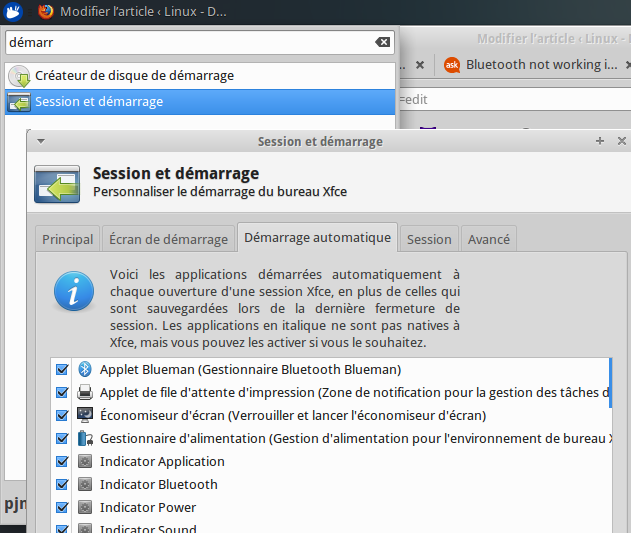 Menu Démarrer > Saisir « demarr » > Sessions et démarrage