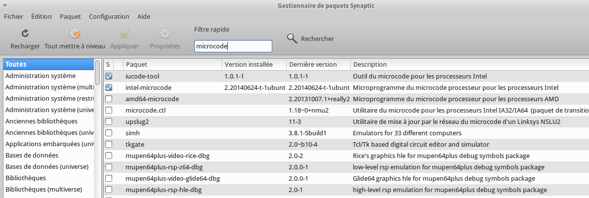 3) Lancer Synaptic : rechercher « microcode » et installer la bonne version : cf copies d’écran ci-dessous