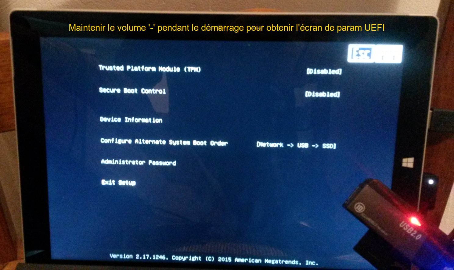 b) Unetbootin : installer la version Live64 de Xubuntu ou Ubuntu 14.04 ou 16.04 LTS - Booter votre SURFACE via la clé USB :