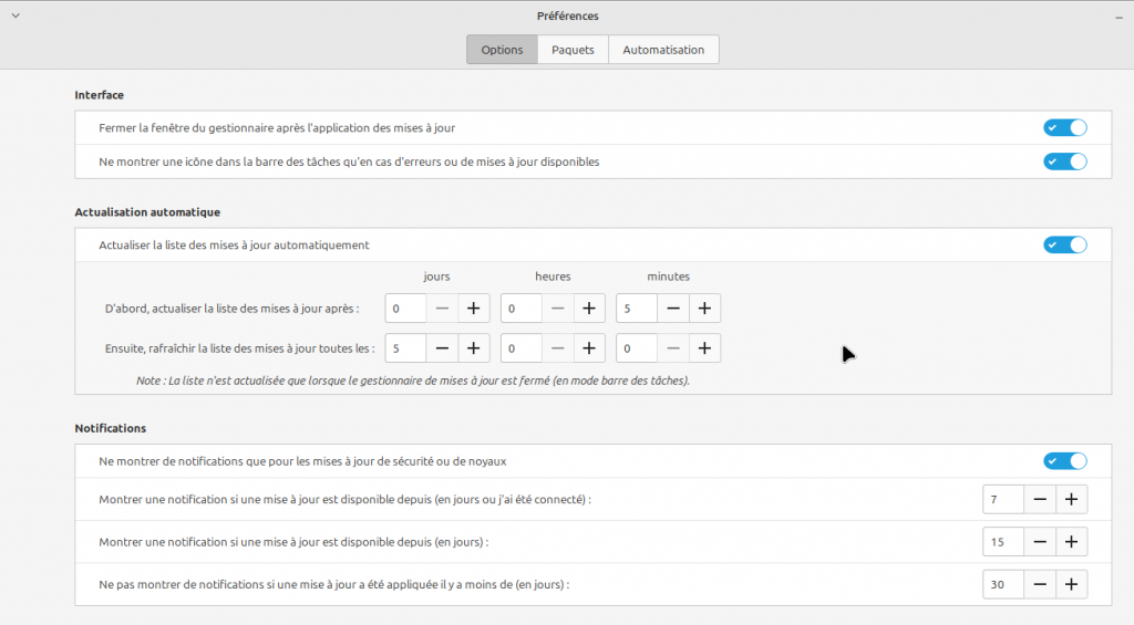 • Cocher les options pour mettre à jour automatiquement les paquets
