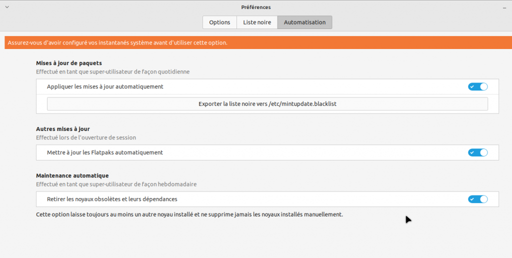 Le Programme de Linux Mint qui permet d’automatiser les mises à jour avec l’en-tête « Préférences » :