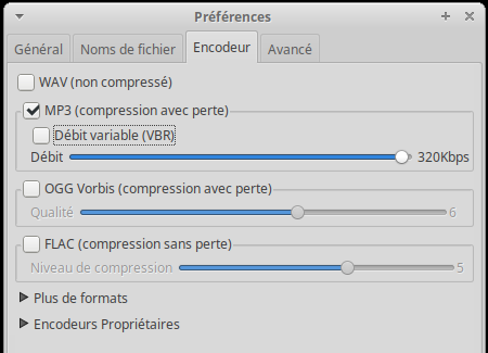 • Onglet « Encodeur » > Cocher « .mp3 » et choisir la qualité maxi : 320 Kbps en débit fixe (décocher variable)