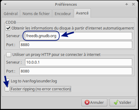 • Onglet « Avancés » > CDDB Serveur= gnudb.gnudb.org permet d’affecter le titre de l’album et des chansons !!!