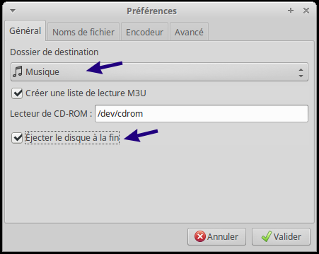 2. Paramétrage de Asunder > Menu : « Préférences » :