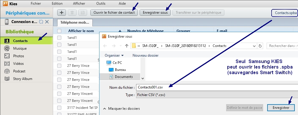 – Aller dans ‘Contacts’ : Ouvrir le fichier Contacts.spb* généré dans le dossier ci-dessus par Kies3