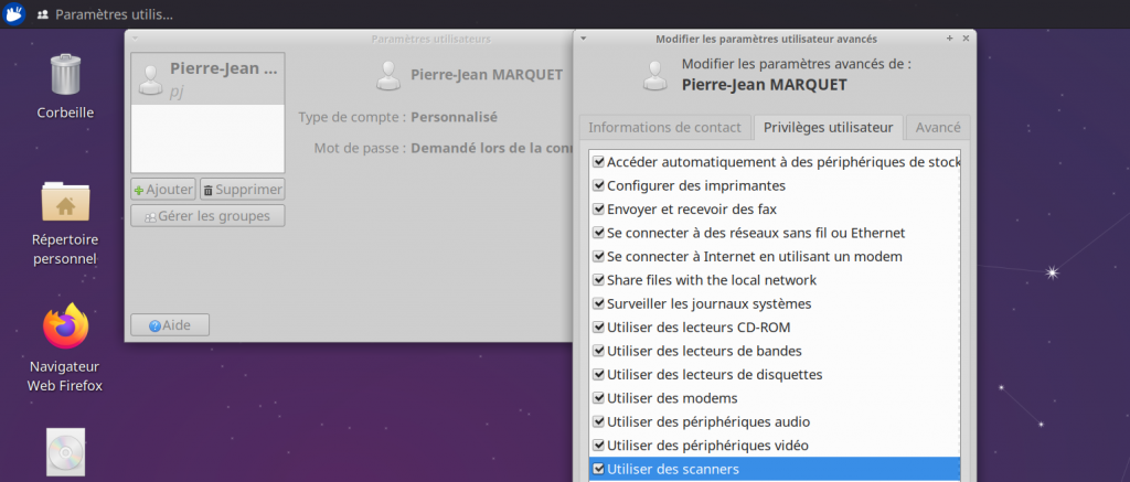 Démarrer > Utilisateurs > Paramètres avancés : on peut ajouter / supprimer les droits