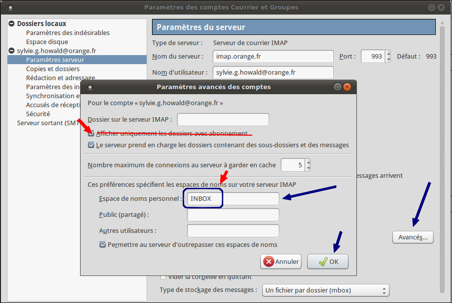 - Paramètres du serveur > Avancés .. > Saisir « INBOX » dans « Espace de noms personnel » (même si des » s’ajoutent)